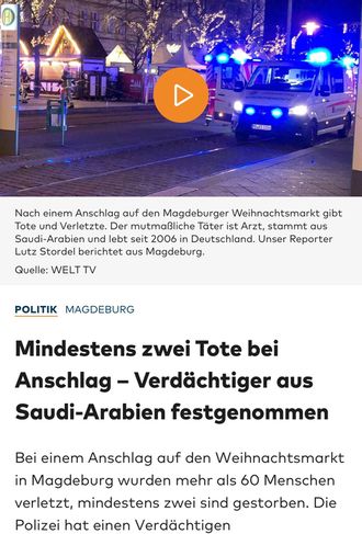 Ein radikaler arabischer Terrorist rast mit seinem Auto in einen Weihnachtsmarkt. Was kommt nun als nächstes liebe Regierung? Ein Tempolimit? Dieser Anschlag ist das Ergebnis einer dystopischen Politik, die in allen Belangen versagt hat. Von diesen Schläfern befinden sich noch hunderte unter uns. Danke für Nichts Genossin Merkel, der CDU, Rot-Grün und allen, die diese Politik unterstützt haben.