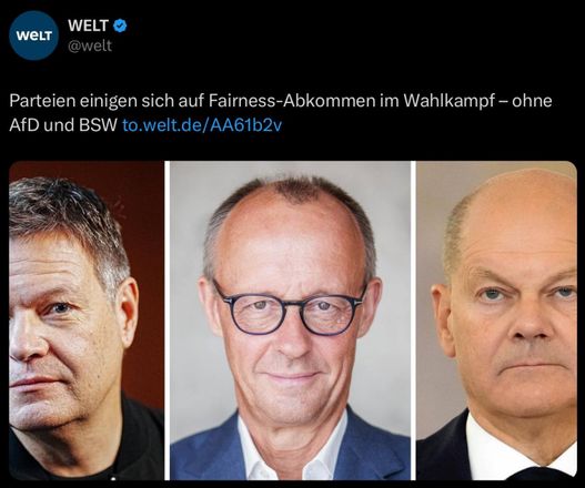 Die Brandmauer der sozialistischen Einheitsfront aus CDUCSUSPDFDPdieGrünen (Team UnsereDemokratie™) zeigt eindeutig, dass Deutschland ein von einer linken Parteien-Oligarchie beherrschtes Land und keine Demokratie mehr im Sinne der Volkssouveräntität ist. Hey Tagesschau-Fan, falls Dir Artikel 21 des Grundgesetzes nicht bekannt sein sollte, helfe ich da gern nach: "(1) Die Parteien wirken bei der politischen Willensbildung des Volkes mit." Und da steht irgendwie nicht, die Parteien übernehmen als Oligopol die Macht im Lande und grenzen andere aus.