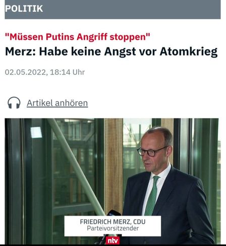 Die Kriegsgeilheit der Deutschen finde ich beängstigend. Und ich finde es sehr bemerkenswert, wieviele Experten sich danach sehnen, endlich wieder im Kriegszustand mit Russland zu sein. Quasi Unternehmen Barbarossa 2.0. Als ehemaliger Zeitsoldat und Bundeswehr-Ausbilder versuche ich mir gerade vorzustellen, wie diese Teufelskerle, die sich in der Corona-Pandemie ohne Maske nicht einmal in den Supermarkt getraut haben, ihren Arsch an der Seite der Ukraine in einem Krieg riskieren wollen. Und was ich auch sehr geil finde: Seit Verteidigungsministerin Frau von der Laien ähhh Leyhen wurde die Bundeswehr viele Jahre lang sukzessive abgewrackt. Die Wehrpflicht wurde abgeschafft, jegliche Waffen waren böse, Munition war nicht ausreichend vorhanden ... und ein Großteil der Panzer und Flugzeuge war gar nicht einsatzbereit ... aber Gott sei Dank hatte jede Kaserne eine Kita. Ganz wichtig fand ich auch die Vorgaben für den Kohlenstoffmonoxidgehalt in Panzern: der durfte nicht über einem Grenzwert liegen, weil sonst eine "fruchtwasserschädigende Wirkung" bei schwangeren Soldatinnen drohte. Aber jetzt haben die Deutschen plötzlich wieder unglaubliche Lust, "kriegstüchtig" zu werden (das ist übrigens ein Begriff, den Joseph Gobbels gern genutzt hat) und Unternehmen Barbarossa 2.0 zu starten. Köstlich.
